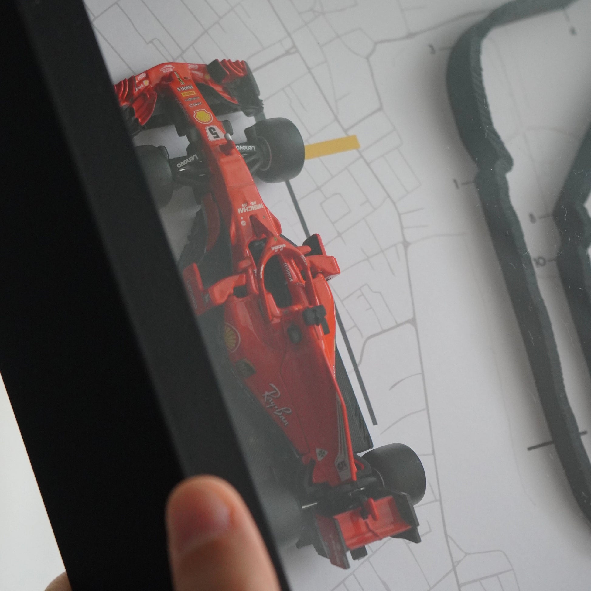 Includes a 1:43 scale F1 car and a 3D printed track with detailed elevation changes.